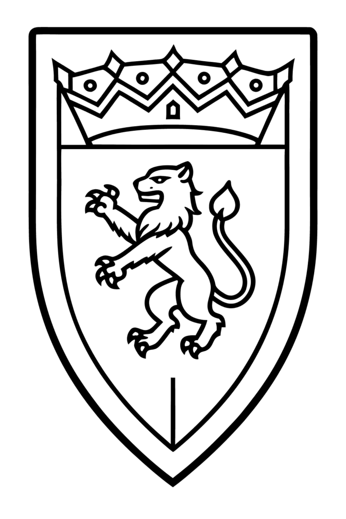 Un león estilizado en pose heráldica (rampante) al estilo de escudo de armas con simbolismo tradicional real medieval. La forma de escudo y corona arriba sitúan al león como símbolo de nobleza y poder dinástico. El banner con lema y escudo familiar celebran siglos de uso del león como símbolo de coraje nobleza.
