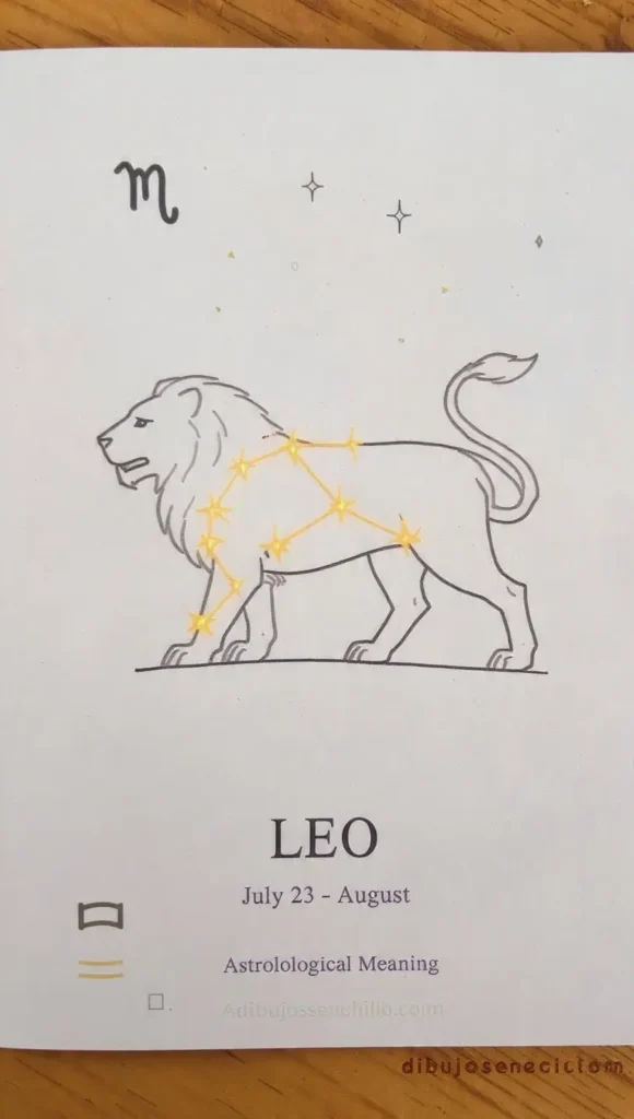 Un león formado por estrellas conectadas mostrando patrón celestial del zodiaco Leo como arte astronómico hermoso. Los símbolos zodiacales y rango de fechas conectan la constelación con astrología y personalidades Leo. El cielo nocturno y significado astrológico celebran cómo los humanos han proyectado el león en las estrellas culturalmente.