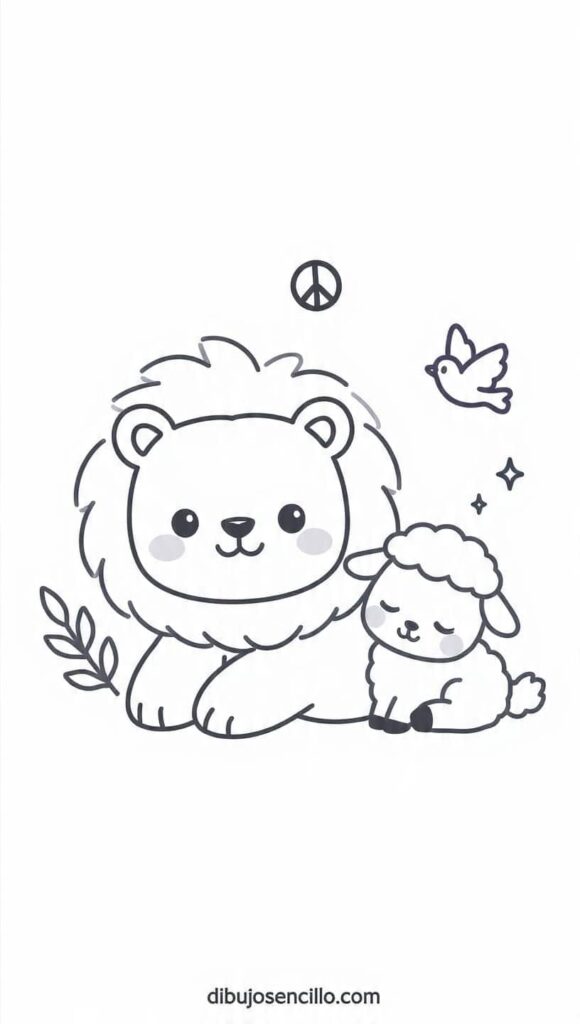 Un león acostado calmadamente junto a cordero pequeño mostrando coexistencia pacífica con simbolismo bíblico de paz. La rama de olivo y paloma refuerzan el mensaje universal de paz entre enemigos naturales tradicionales. Los símbolos de paz y mensaje de unidad representan esperanza de armonía imposible haciéndose posible milagrosamente.