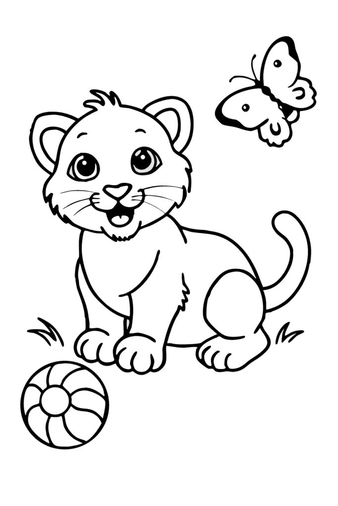 Un cachorro de león pequeño con patas desproporcionadamente grandes en pose juguetona persiguiendo mariposa o pelota. La madre observando en la distancia y juguetes esparcidos crean escenario de infancia protegida segura. La energía juguetona y pasto de sabana capturan la inocencia de cachorros antes de convertirse en cazadores formidables.