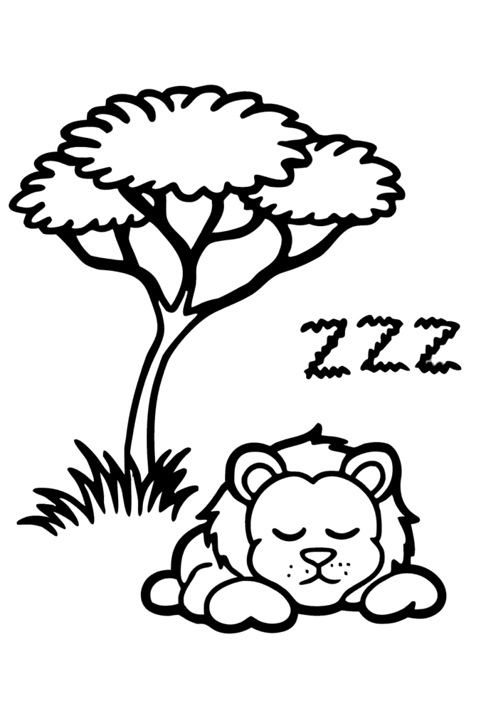 Un león descansando en la sombra bajo árbol de acacia en pose relajada durmiendo siesta pacífica con ojos cerrados. Las letras «Z» flotantes y sol ardiente arriba contrastan con la sombra fresca del refugio natural. Los pájaros en el árbol y ambiente de sabana capturan el ritmo de vida salvaje donde descanso es vital.