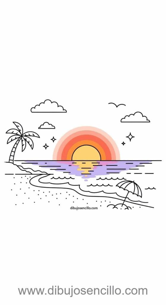 Una playa serena con el sol grande hundiéndose en el horizonte entre el océano y el cielo. Las olas suaves y la arena en primer plano crean profundidad simple pero efectiva. La silueta de palmera a un lado añade contexto tropical perfecto y balance visual.