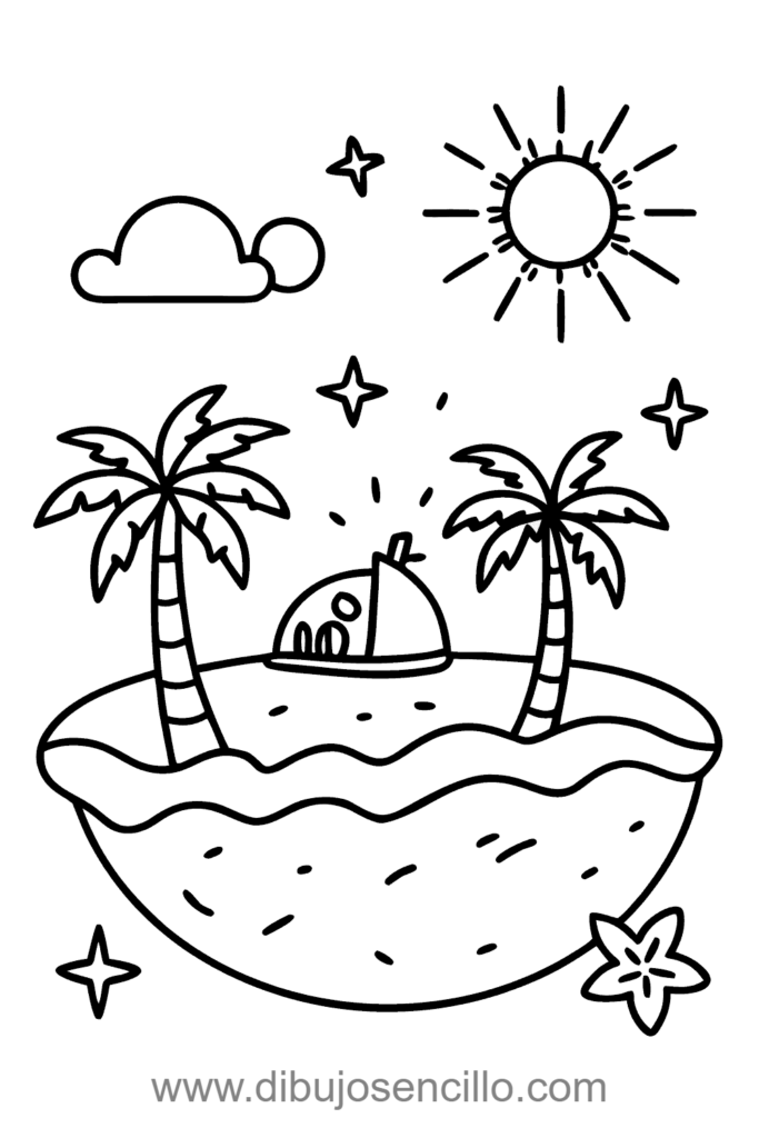 El estilo kawaii con colores tropicales brillantes hace que esta isla sea soñada. Es ideal para practicar composiciones centradas simples y crear escenas de ensueño vacacional.