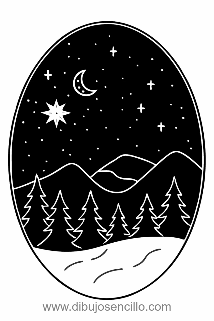 El estilo minimalista con siluetas hace que este paisaje nocturno sea atmosférico. Es excelente para practicar contraste dramático y crear escenas nocturnas místicas fácilmente.