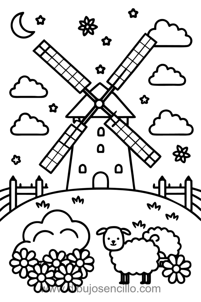 Una pradera verde ondulante con un molino de viento tradicional de cuatro aspas como elemento distintivo. Las flores en primer plano y ovejas pastando crean una escena pastoral idílica. Las nubes esponjosas y tulipanes evocan el campo holandés clásico perfectamente.