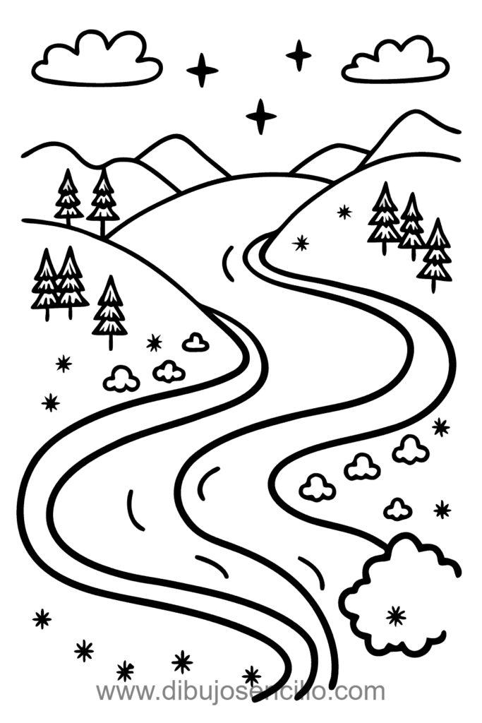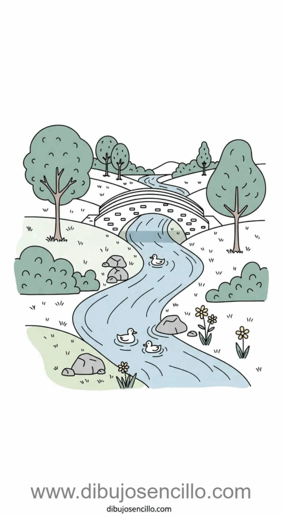 Un río serpenteante fluyendo por el centro con un puente arqueado simple cruzando sobre el agua. Los árboles y arbustos en las orillas enmarcan el río naturalmente creando composición equilibrada. Los patitos nadando y piedras añaden detalles encantadores sin complicar el diseño.