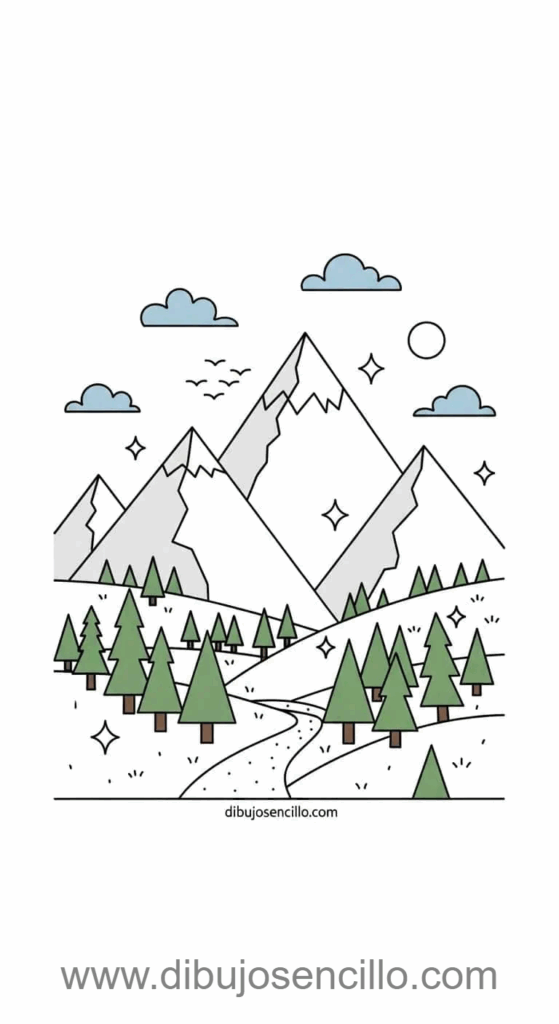 Montañas triangulares simples en el fondo con una fila de pinos también triangulares en primer plano. Esta composición en capas crea sensación de distancia y profundidad natural fácilmente. Los pájaros volando y sendero añaden vida y movimiento a la escena montañosa.