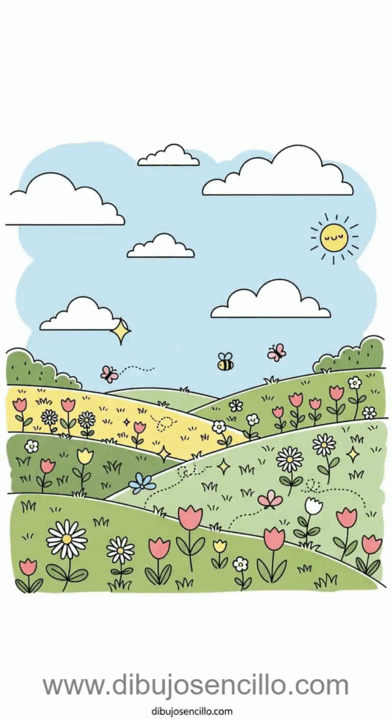 Colinas onduladas cubiertas de flores silvestres coloridas dispersas por el primer plano y plano medio. Las margaritas y tulipanes simples crean variedad sin complicación excesiva. Las mariposas y abejitas volando añaden movimiento y vida primaveral al campo florido.
