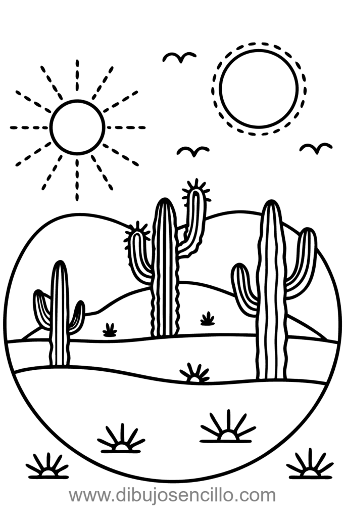 El estilo minimalista con colores cálidos del desierto hace que este clima extremo sea hermoso. Es ideal para practicar líneas onduladas para dunas y formas simples de cactus.