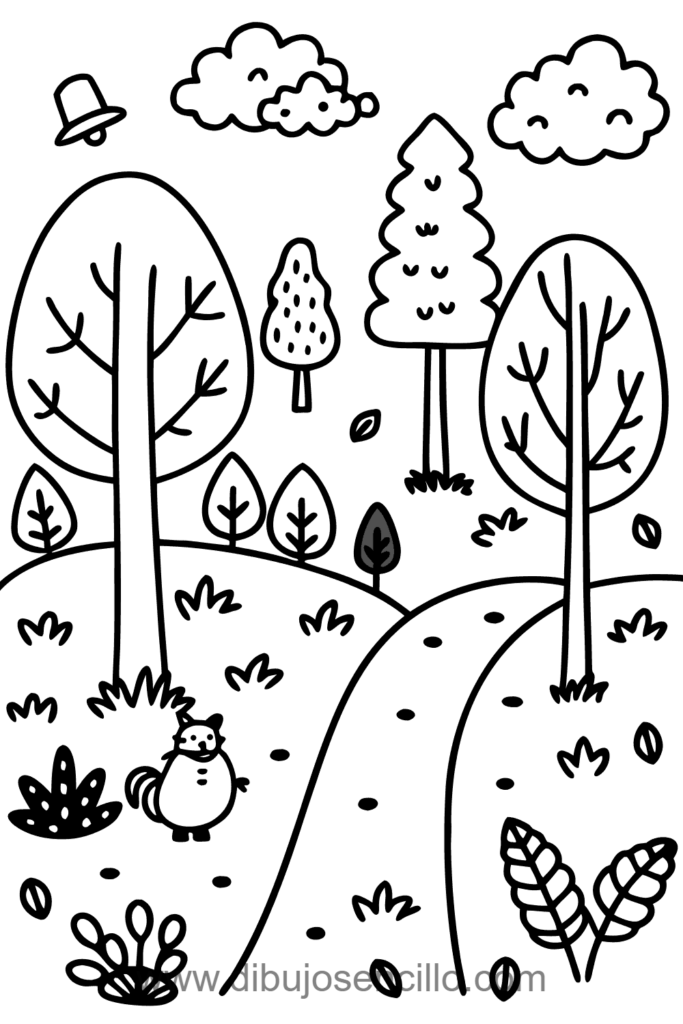 Un bosque otoñal con árboles de copas redondeadas en colores cálidos de naranja, rojo y amarillo. Las hojas caídas en el suelo y el sendero serpenteante crean profundidad y guían la vista. La ardilla y hongos añaden vida silvestre característica del otoño en el bosque.