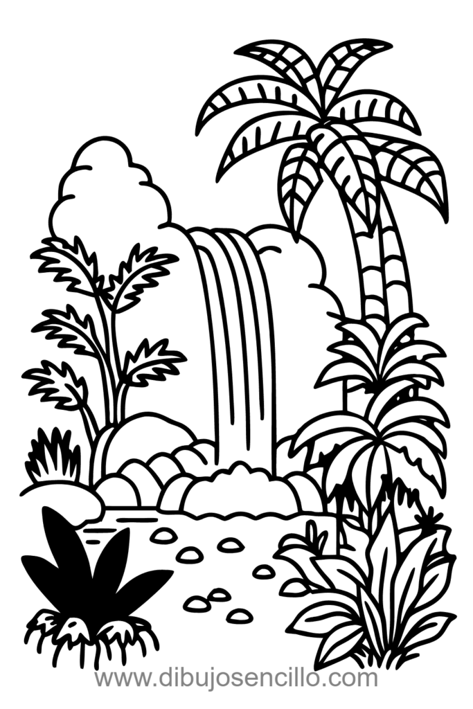 El estilo de caricatura con verdes vibrantes hace que la selva sea exótica y accesible. Es excelente para practicar agua en movimiento y plantas tropicales variadas simples.