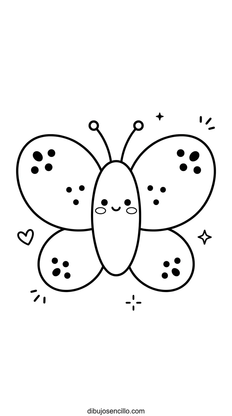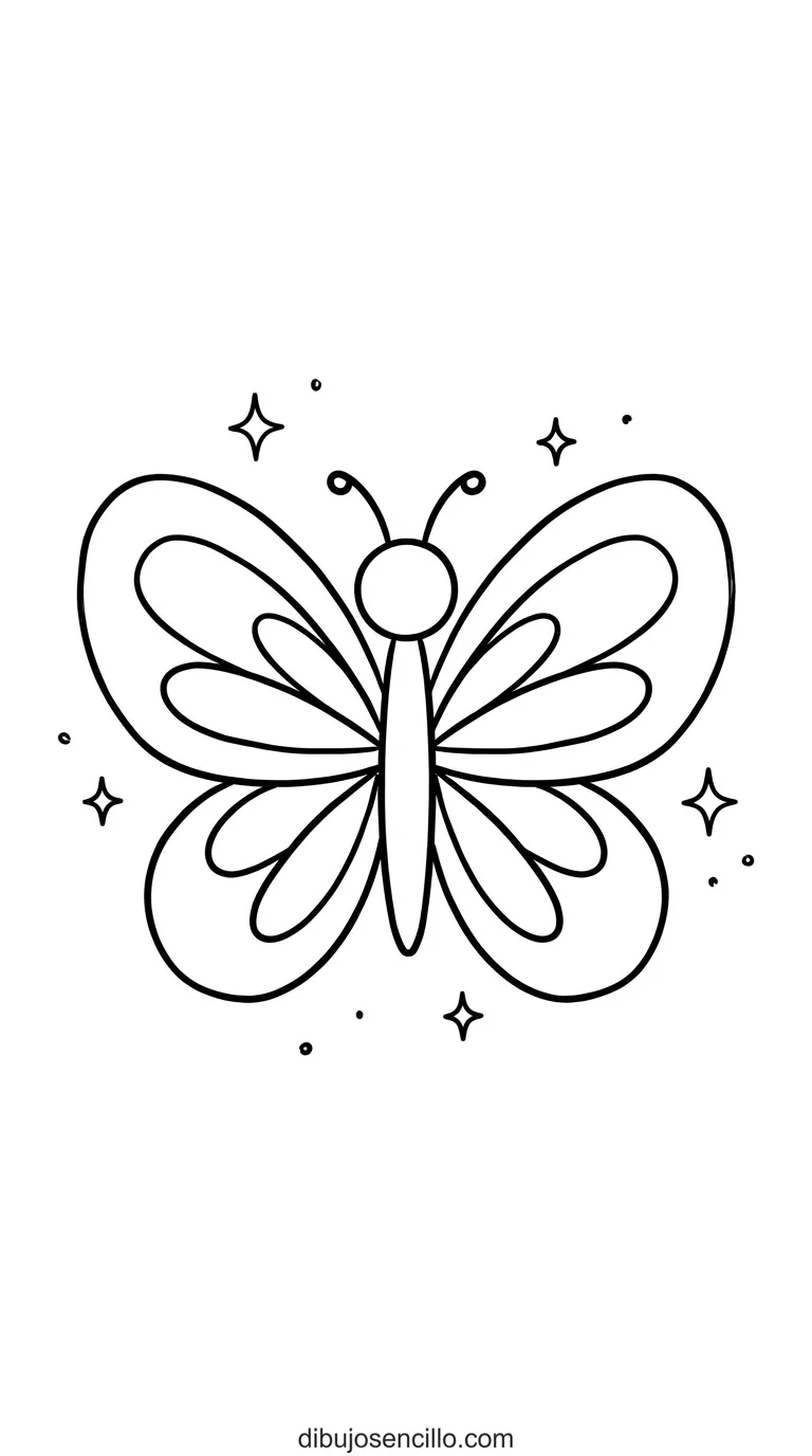 El estilo simétrico con diseño espejo hace que esta mariposa sea educativa y hermosa. Es ideal para aprender sobre simetría bilateral mientras se dibuja un insecto delicado.