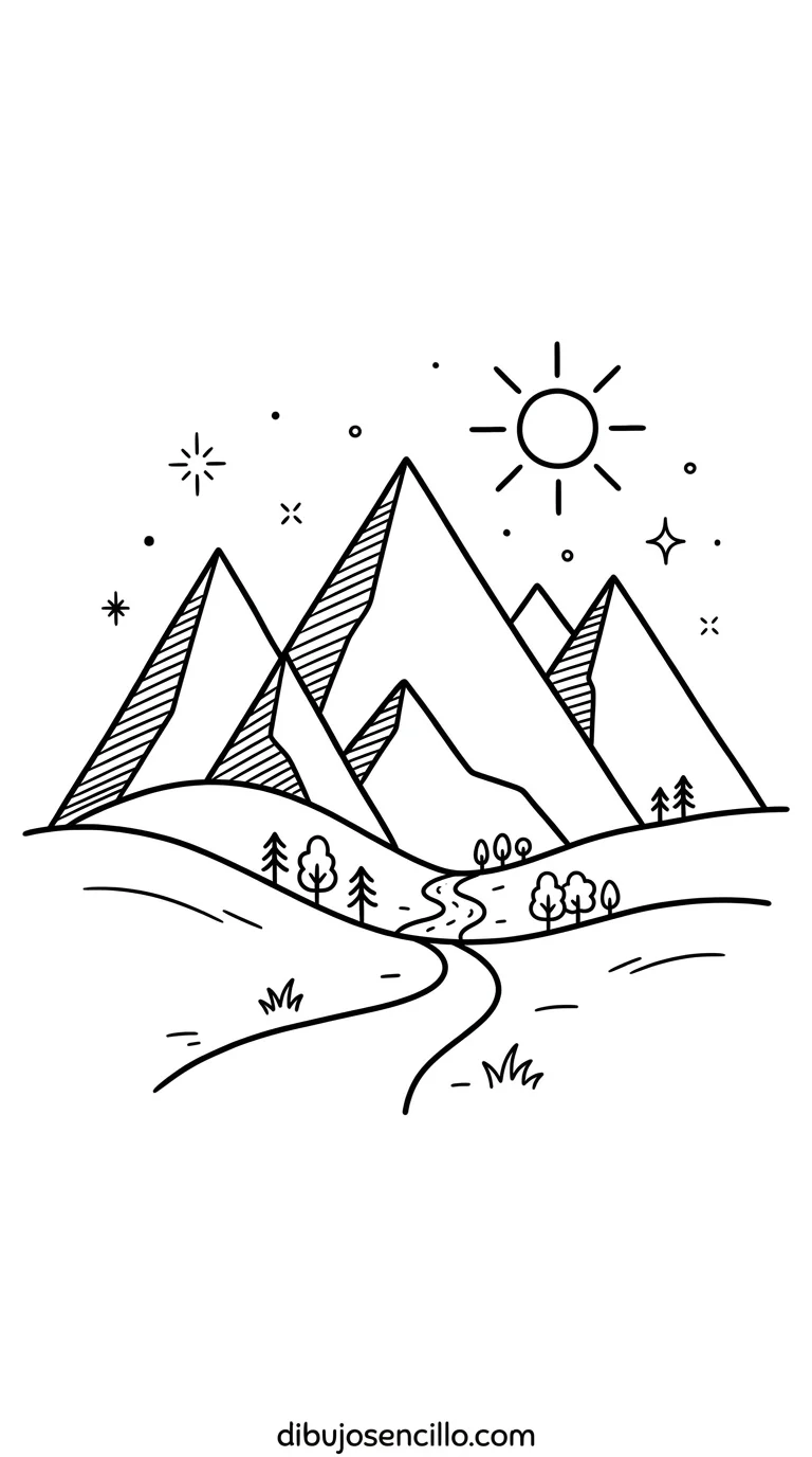El estilo paisajístico con triángulos superpuestos hace que estas montañas sean fáciles y impresionantes. Es ideal para aprender sobre profundidad y perspectiva básica en dibujos naturales.