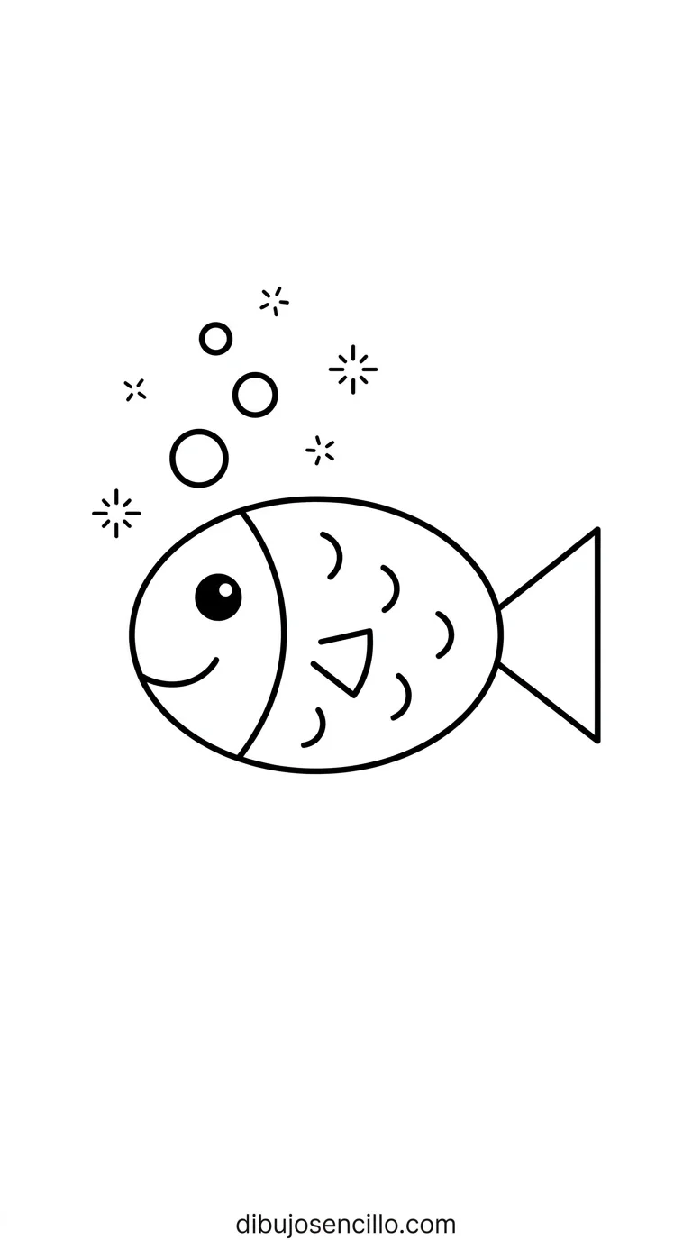 Un pez simple con cuerpo ovalado, aleta triangular de cola y ojo circular redondo mostrando criatura acuática. Las burbujas pequeñas y sugerencia de escamas crean animal marino básico pero reconocible.