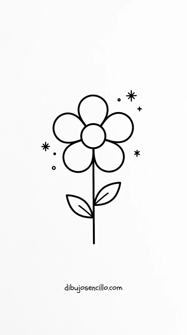 Una flor simple con cinco pétalos redondos alrededor de centro circular y tallo recto vertical. Las hojas pequeñas y diseño natural crean dibujo botánico básico perfecto para empezar.
