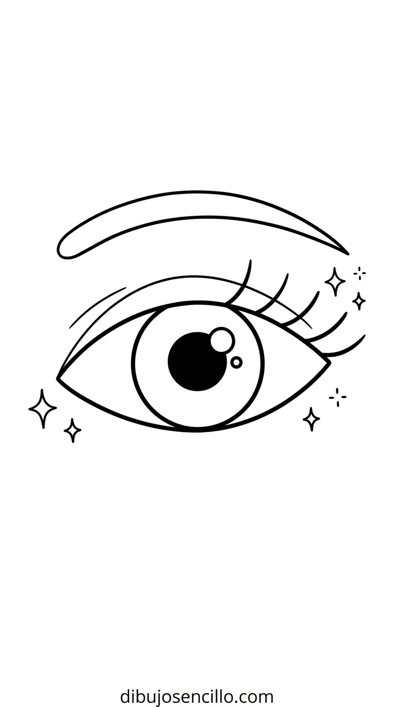 Un ojo expresivo con forma almendrada, iris circular y pupila de punto con pestañas simples arriba. El punto de brillo y ceja encima crean ojo realista básico lleno de expresión.
