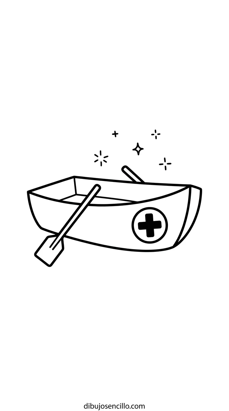 Un bote salvavidas pequeño con símbolo de cruz roja característico de emergencia. Los remos pequeños y símbolo médico crean embarcación de rescate de seguridad.