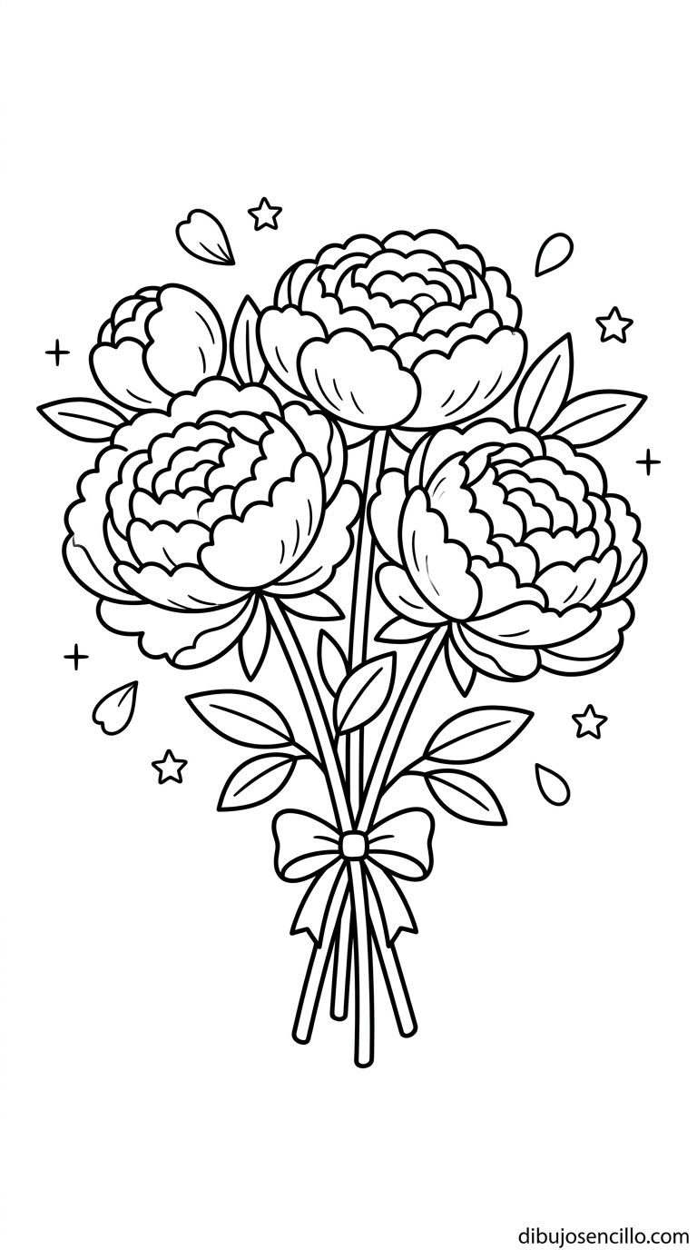 Un ramo de peonías exuberantes con sus cabezas florales enormes y generosas llenas de pétalos en capas, la flor más lujosa y romántica del universo floral aesthetic que aparece en todas las bodas y celebraciones más soñadas. Su abundancia de pétalos la hace visualmente impresionante aunque se dibuje con formas simples.