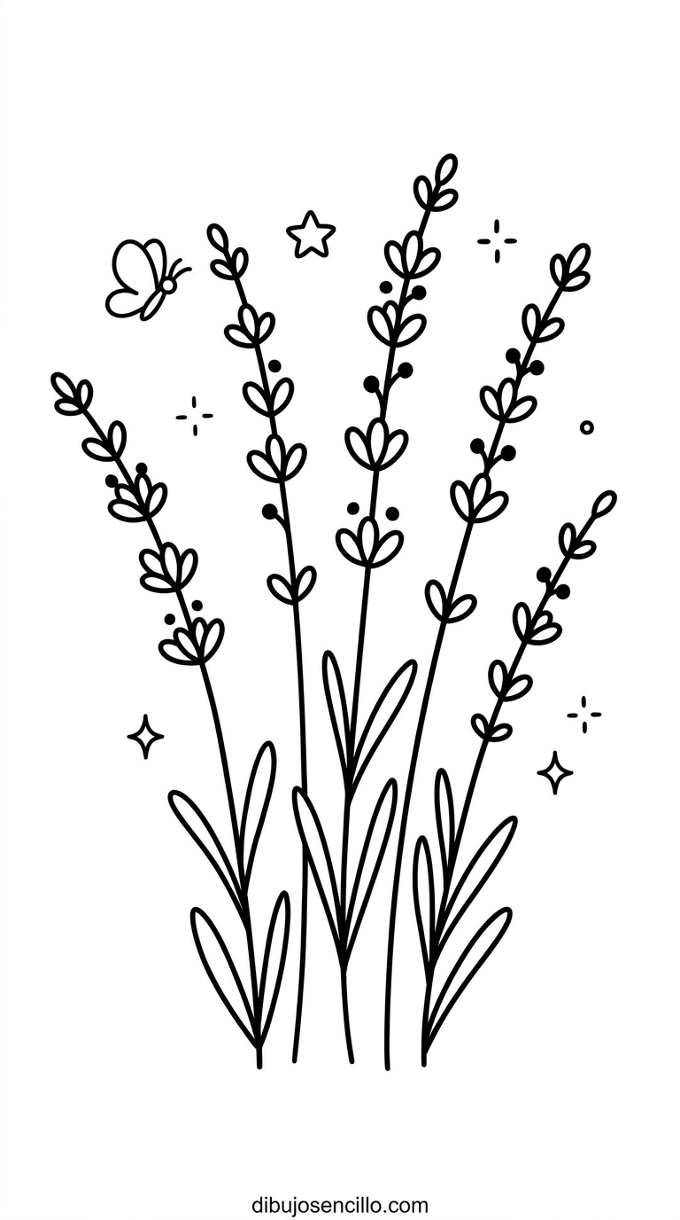 Ramas de lavanda con sus tallos esbeltos y sus capullos característicos alineados perfectamente, la planta más aesthetic y aromática del universo floral que evoca campos de Provenza, paz y bienestar. Su forma repetitiva de capullos a lo largo del tallo la hace muy fácil y satisfactoria de dibujar.