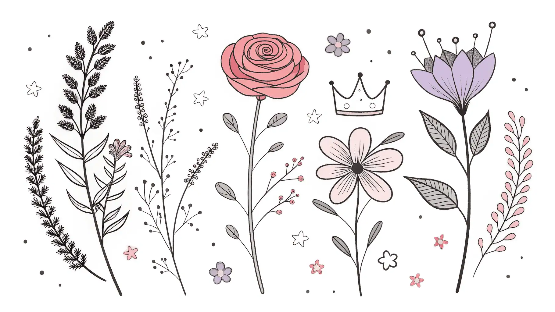 - Diviértete: Las flores aesthetic se caracterizan por líneas finas y delicadas con pequeños detalles como puntos de estambre, nervios en las hojas y pétalos ligeramente imperfectos que las hacen más naturales.