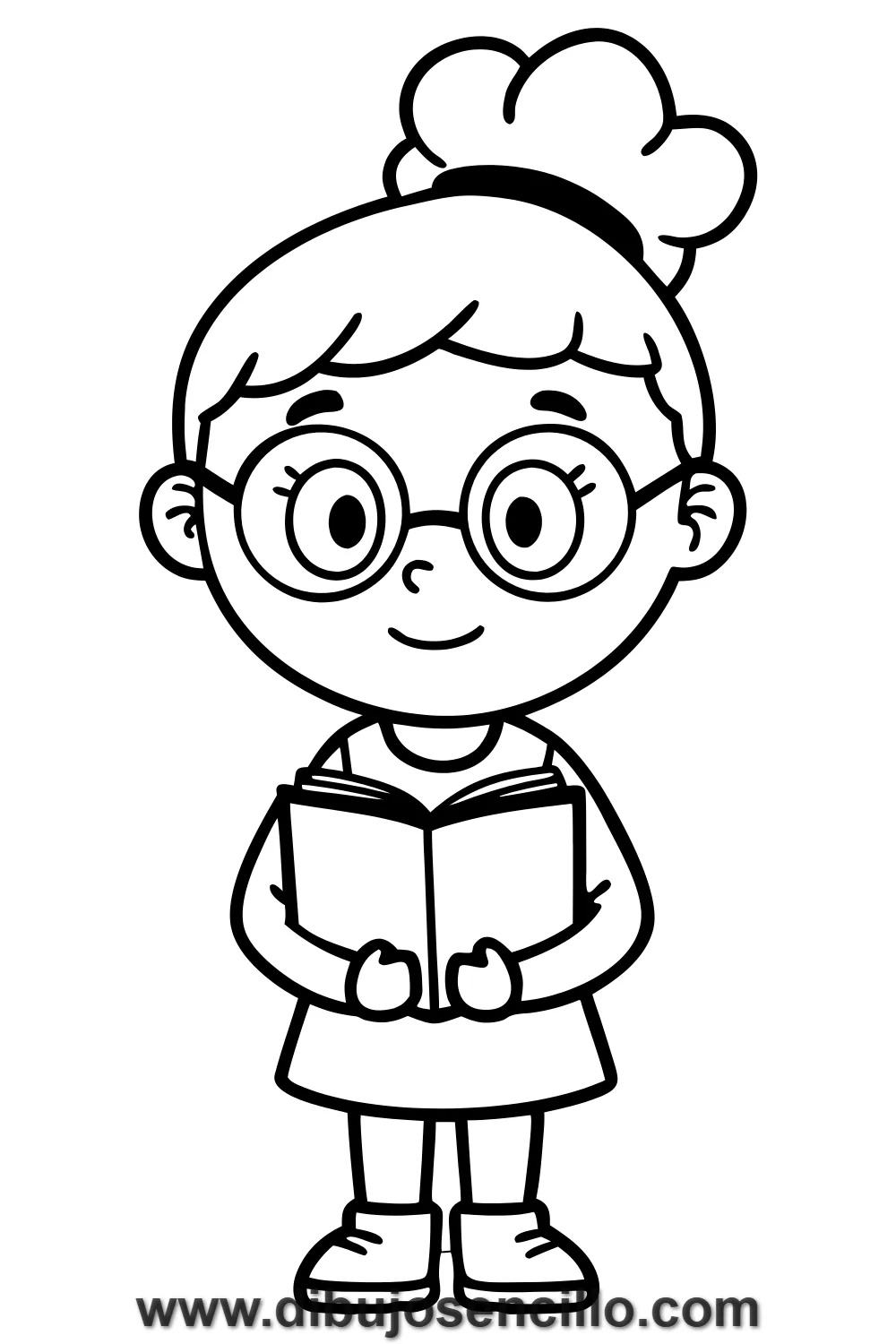Una chica intelectual y curiosa con sus gafas redondas y su libro siempre en mano, con expresión de concentración total en su lectura favorita. Las gafas añaden un toque de personalidad sofisticada con solo dos pequeños óvalos superpuestos sobre los ojos.