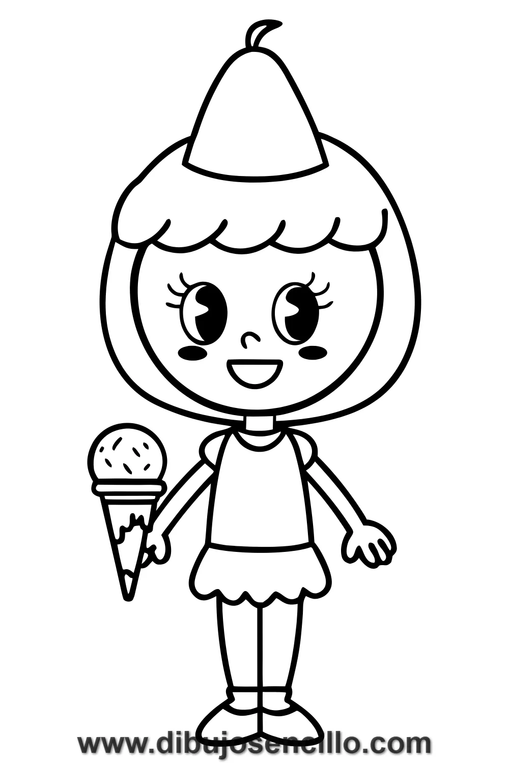 Una chica radiante de felicidad sosteniendo su helado favorito con una sonrisa que lo dice todo sobre lo delicioso que está. El cono triangular y la bola redonda del helado se dibujan con las formas más básicas posibles y el resultado es irresistible.