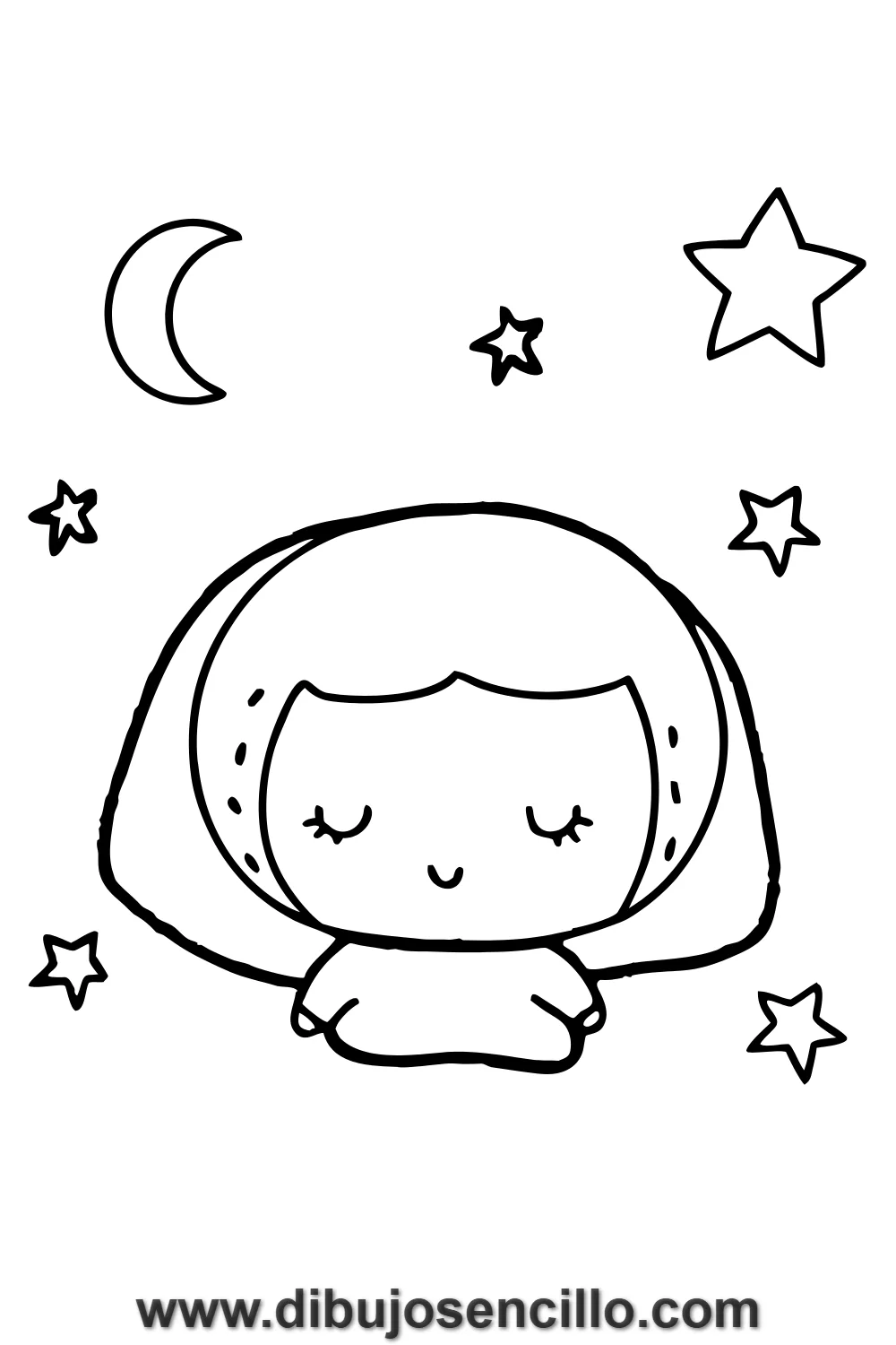 El diseño de la chica durmiendo enseña a representar el descanso y la paz usando ojos cerrados en simples curvas y elementos nocturnos decorativos. Es ideal para ilustraciones de cuentos de buenas noches y decoraciones de cuartos infantiles.