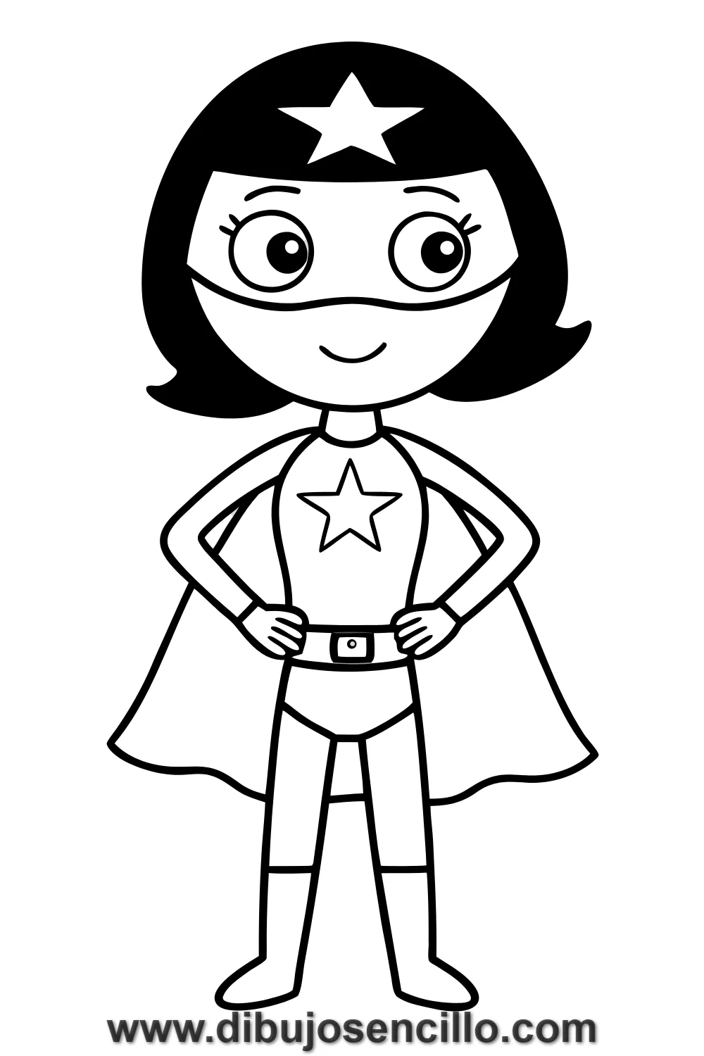 Una superheroína con toda la actitud del mundo, posando con manos en las caderas y capa ondeante lista para salvar el día con valentía y estilo. Su máscara y su estrella en el pecho la convierten en una heroína reconocible al instante.