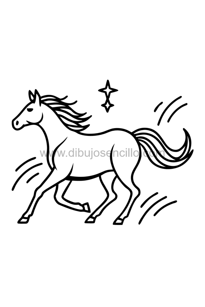 El estilo dinámico hace que este caballo corredor sea enérgico y simple, ideal para principiantes. Este tipo de dibujo es perfecto para practicar poses horizontales y efectos de movimiento rápido.