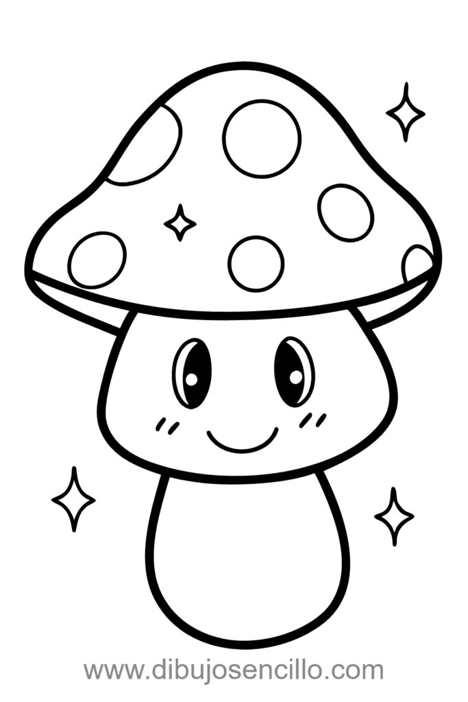 El estilo kawaii hace que este hongo sea irresistible y simple. Es ideal para practicar formas redondeadas y crear expresiones faciales adorables.
