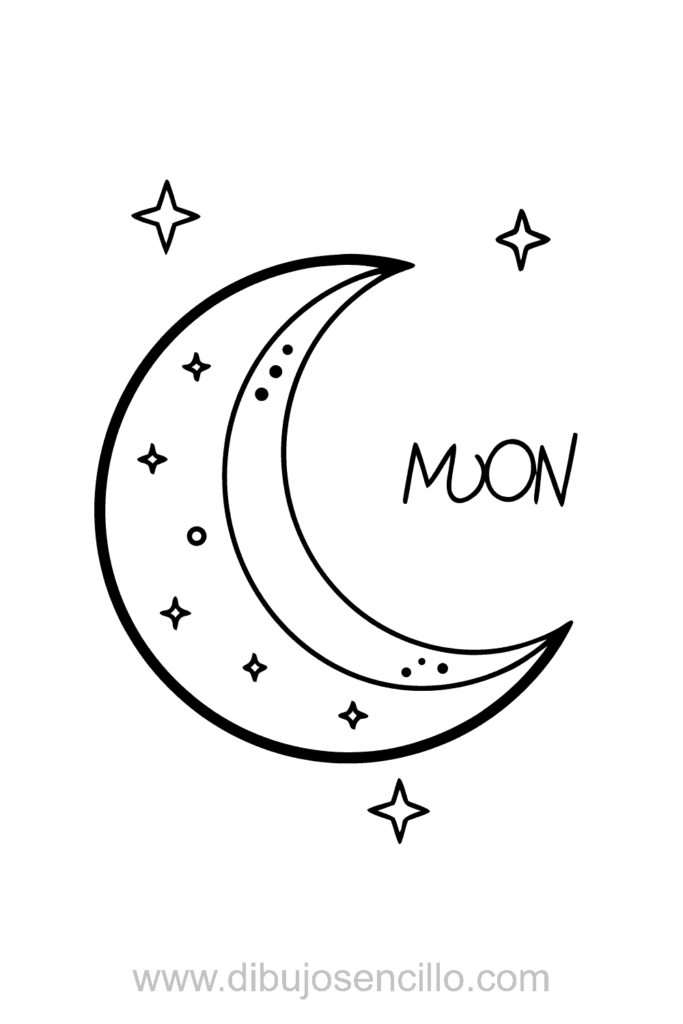 Una luna creciente curva con palabra «MOON» escrita debajo claramente legible. Las estrellas pequeñas y forma nocturna crean vocabulario astronómico básico educativo.