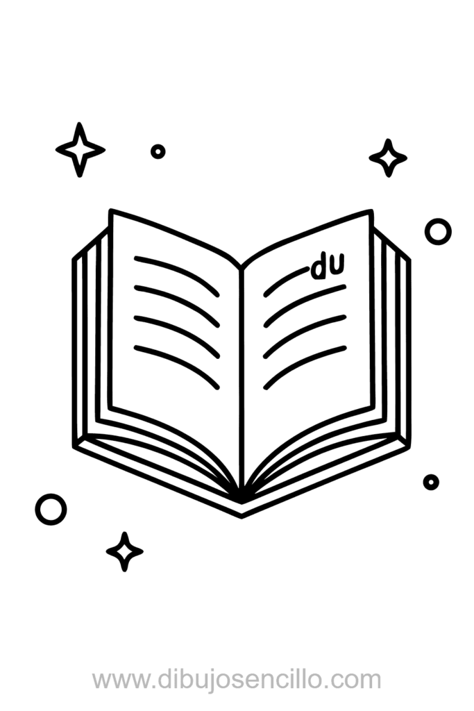 Un libro abierto rectangular con páginas simples y palabra «BOOK» etiquetada. Las líneas de página y texto claro crean objeto educativo reconocible básico.