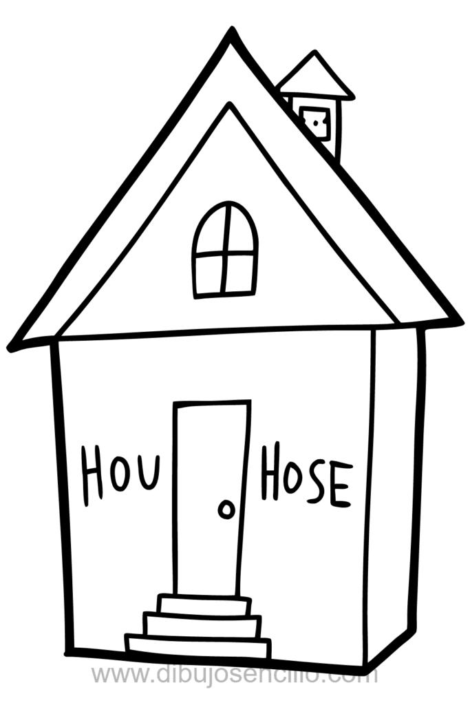 Una casa simple con cuadrado base y techo triangular con «HOUSE» escrito. La puerta pequeña y ventana crean vocabulario de vivienda básico reconocible.