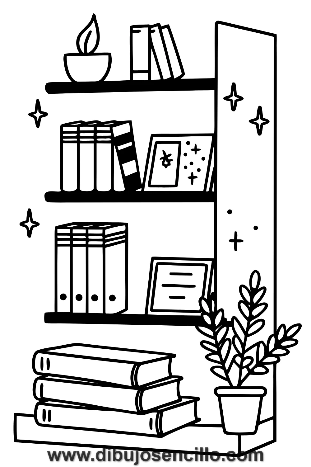 La estantería de libros enseña a dibujar múltiples objetos similares con variaciones de proporción para crear una composición rica. Es una de las ilustraciones más usadas en decoración de habitaciones, cafeterías y espacios de trabajo creativos.