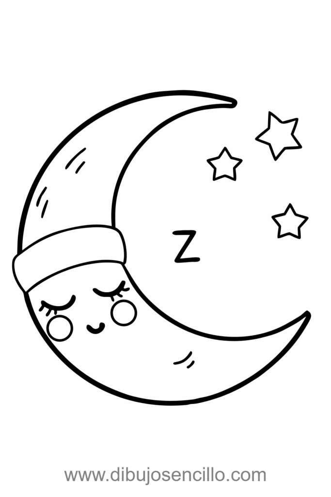 Una luna creciente curvada con carita durmiendo pacíficamente mostrando ojos cerrados y sonrisa pequeña relajada. El gorrito de dormir y letras «Z» flotantes enfatizan el sueño profundo nocturno. Las estrellas alrededor y nubes nocturnas crean atmósfera perfecta para descanso celestial tranquilo.