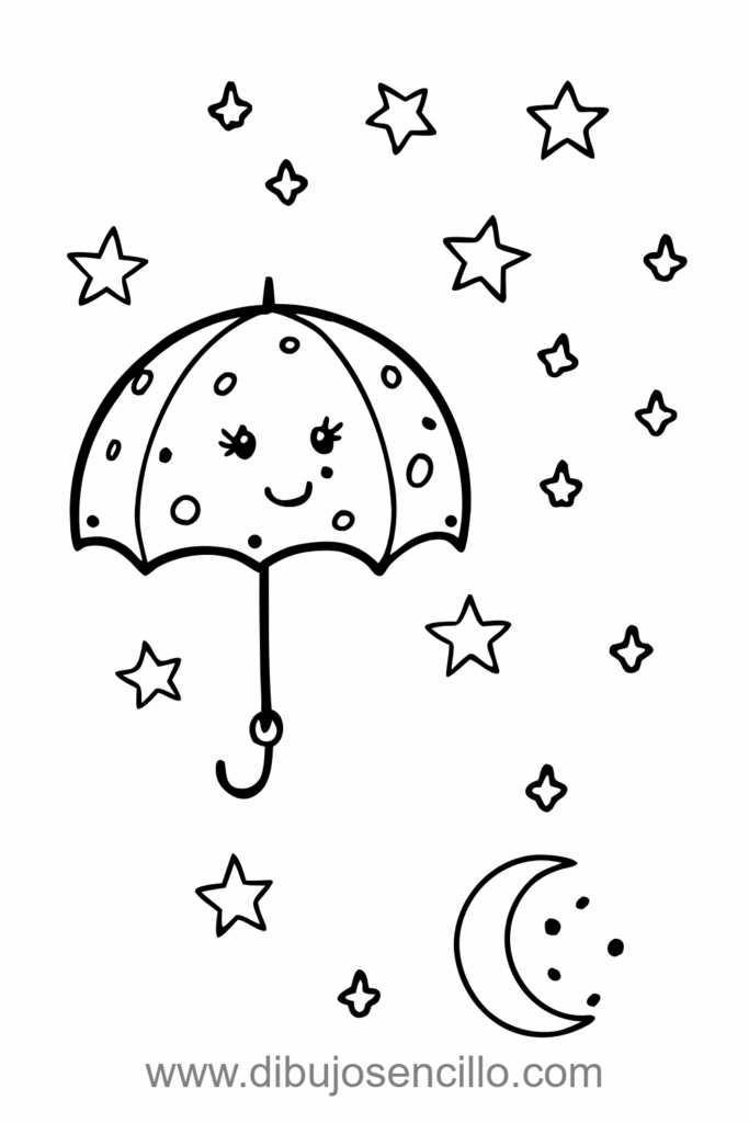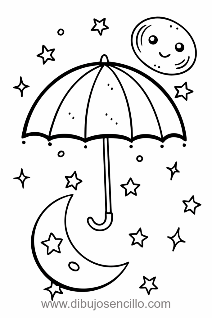 Una luna sosteniendo o bajo paraguas creado con patrón de estrellas protegiéndose del «clima» cósmico. La lluvia de meteoros arriba y cometas desviándose muestran que el paraguas estelar funciona efectivamente. El polvo cósmico y elementos espaciales crean condiciones meteorológicas celestiales únicas e imaginativas.