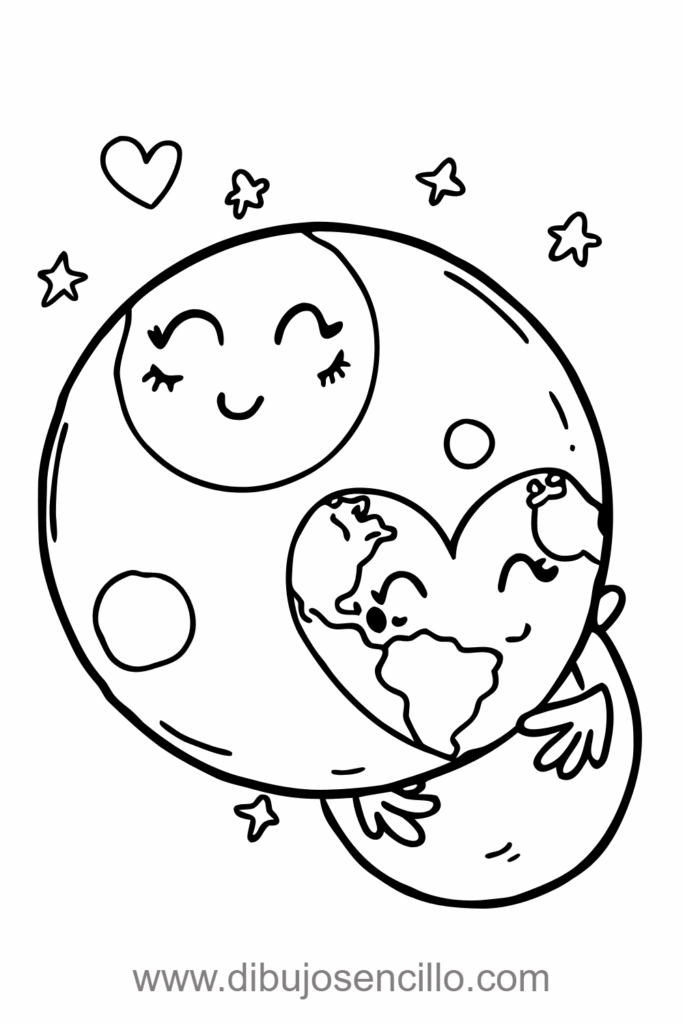 Una luna con brazos envueltos alrededor de la Tierra en abrazo afectuoso, ambos con caras felices. Los corazones conectándolos y visualización de atracción gravitacional representan su vínculo literal y metafórico. El sol observando felizmente añade elemento de familia solar completa y armoniosa.