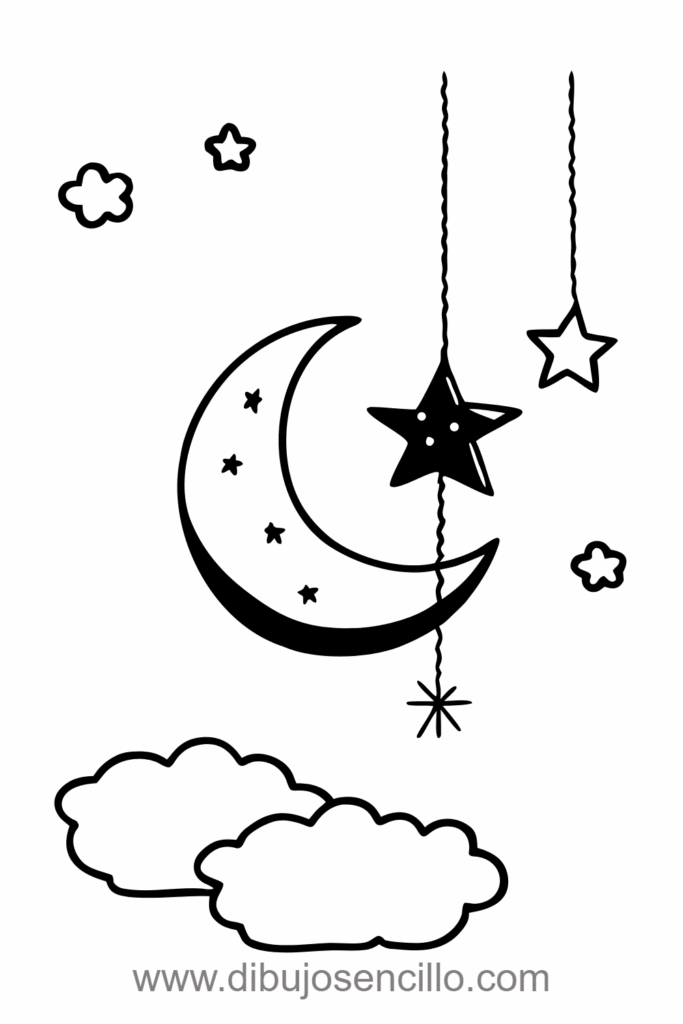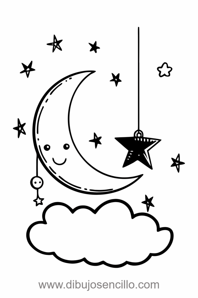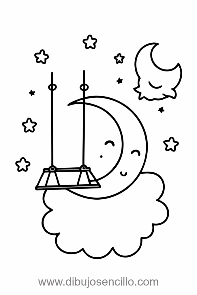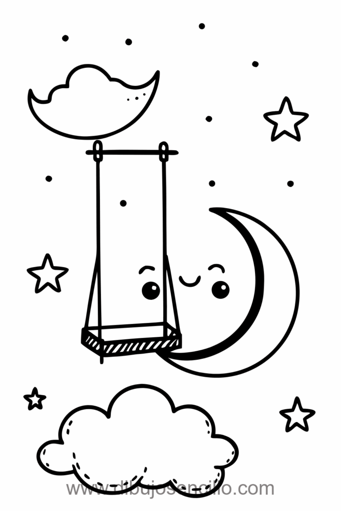 Una luna creciente suspendida o columpiándose de una estrella grande arriba como si fuera un columpio celestial. La cuerda o cadena conectándolos sugiere relación juguetona entre objetos cósmicos. Las otras estrellas observando y nubes abajo crean audiencia para este momento mágico imposible.