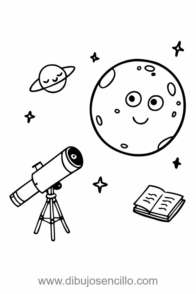 Una luna mirando a través de telescopio de regreso hacia la Tierra u otros planetas como astrónomo curioso. Esta inversión de roles humorística donde el observado se convierte en observador es conceptualmente divertida. La libreta tomando notas y mapas estelares muestran que la luna toma su investigación seriamente.