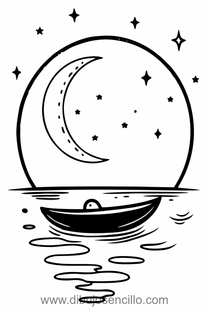 Una luna en cielo nocturno con reflejo espejo perfecto en agua tranquila abajo creando simetría visual hermosa. La silueta de bote y ondas suaves en el agua añaden elementos de vida humana nocturna. Las estrellas también reflejadas completan la duplicación mágica del cielo en la superficie acuática.