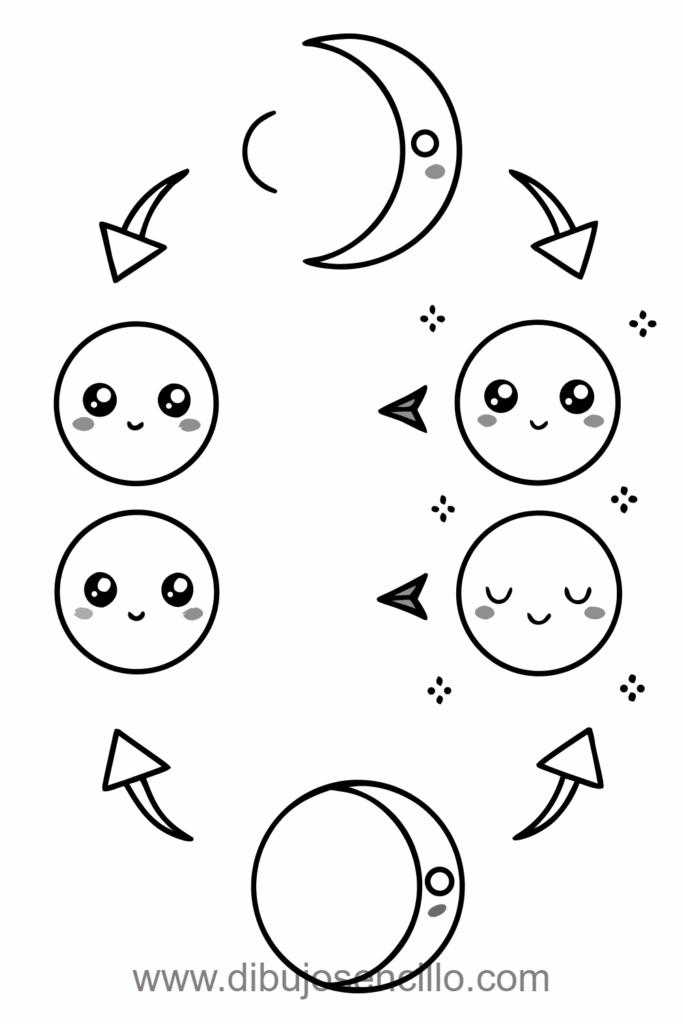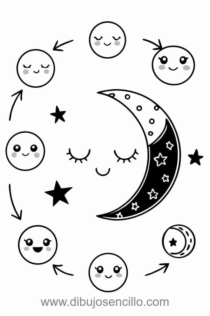 Ocho fases lunares desde luna nueva hasta llena y regreso, cada una con carita sutil mostrando estados de ánimo diferentes. Las etiquetas y flechas de progresión crean herramienta educativa visual clara y memorable. La conexión con calendario ayuda entender el ciclo mensual lunar repetitivo y predecible.