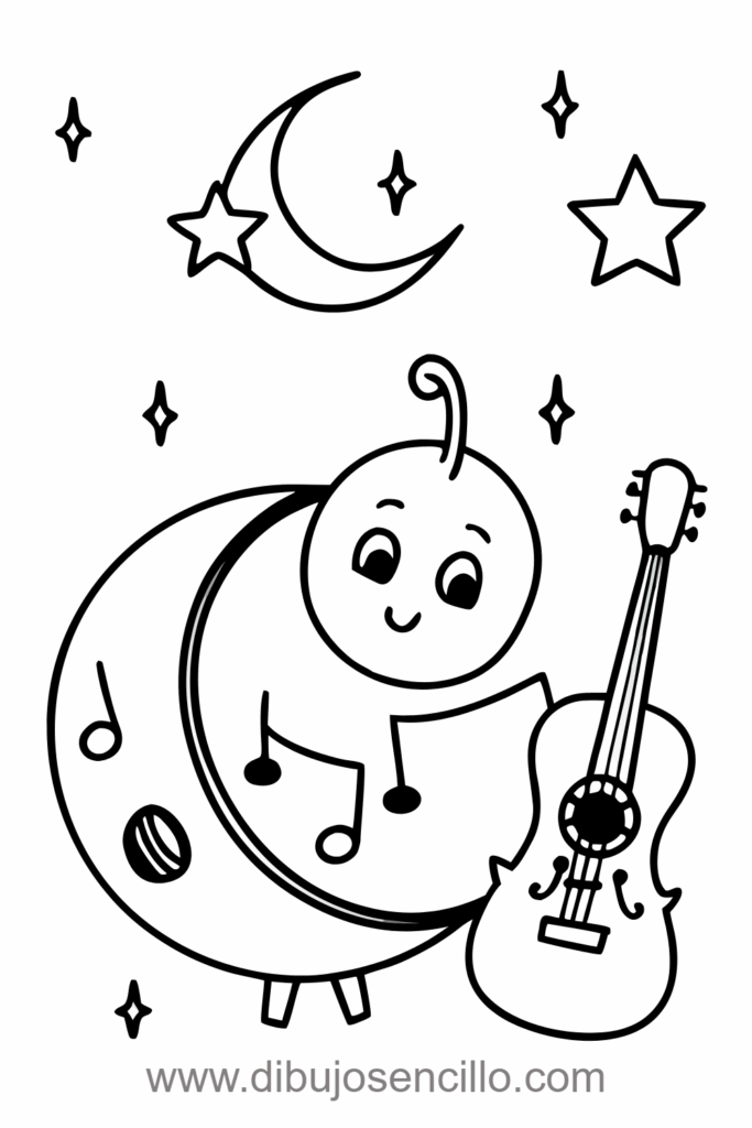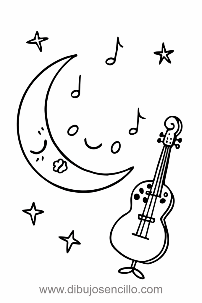 Una luna con brazos sosteniendo guitarra, violín o arpa tocando serenata nocturna para el universo. Las notas musicales grandes flotantes y estrellas como audiencia atenta crean concierto celestial íntimo. Las criaturas nocturnas disfrutando sugieren que esta música lunar afecta toda la vida terrestre positivamente.