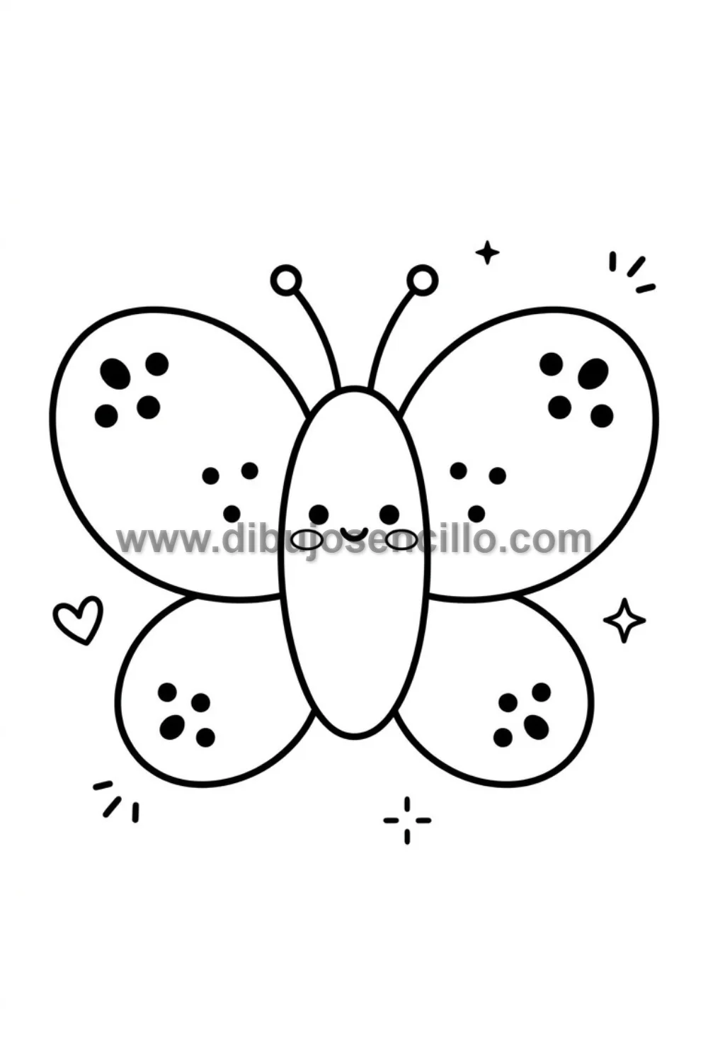 Una mariposa kawaii con su carita alegre en el centro del cuerpo y sus alas decoradas con puntitos simétricos, la criatura más delicada y tierna del mundo natural convertida en personaje adorable con solo añadir unos ojitos y una sonrisa. Sus antenas con bolitas terminales la hacen completamente auténtica y encantadora.