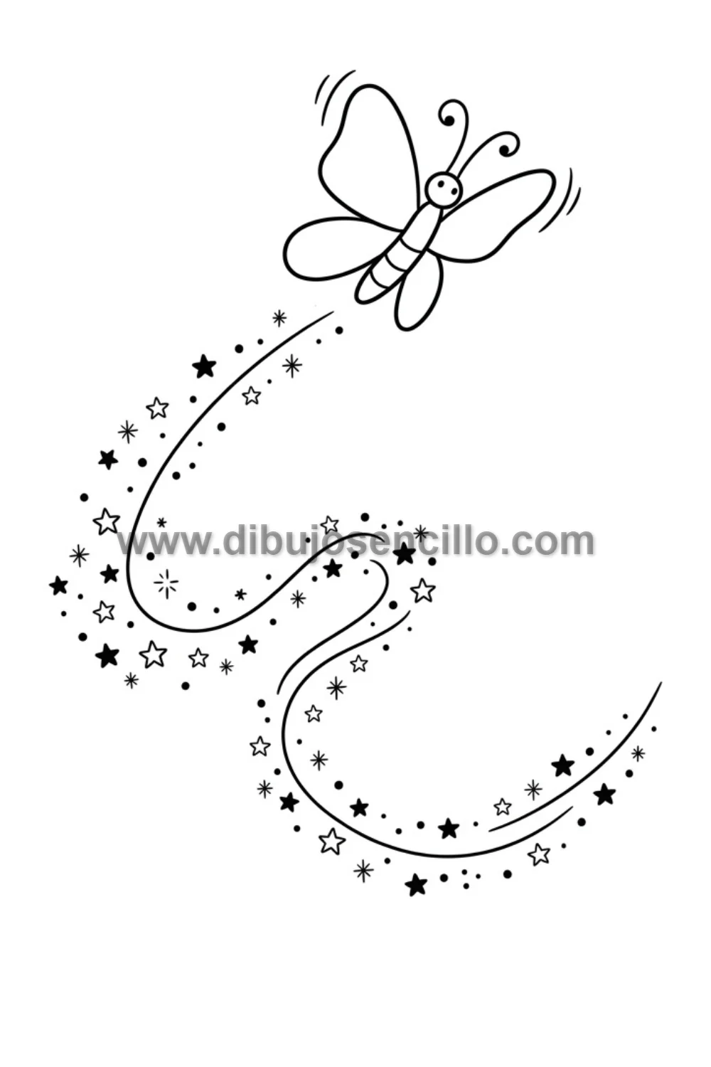 La mariposa con rastro de estrellas enseña a representar el movimiento y la trayectoria de vuelo usando una línea curva de elementos pequeños que sigue al sujeto. Es perfecta para ilustraciones de fantasía, cuentos infantiles, portadas de libros mágicos y cualquier composición que quiera añadir un toque de magia y movimiento a la figura de la mariposa.