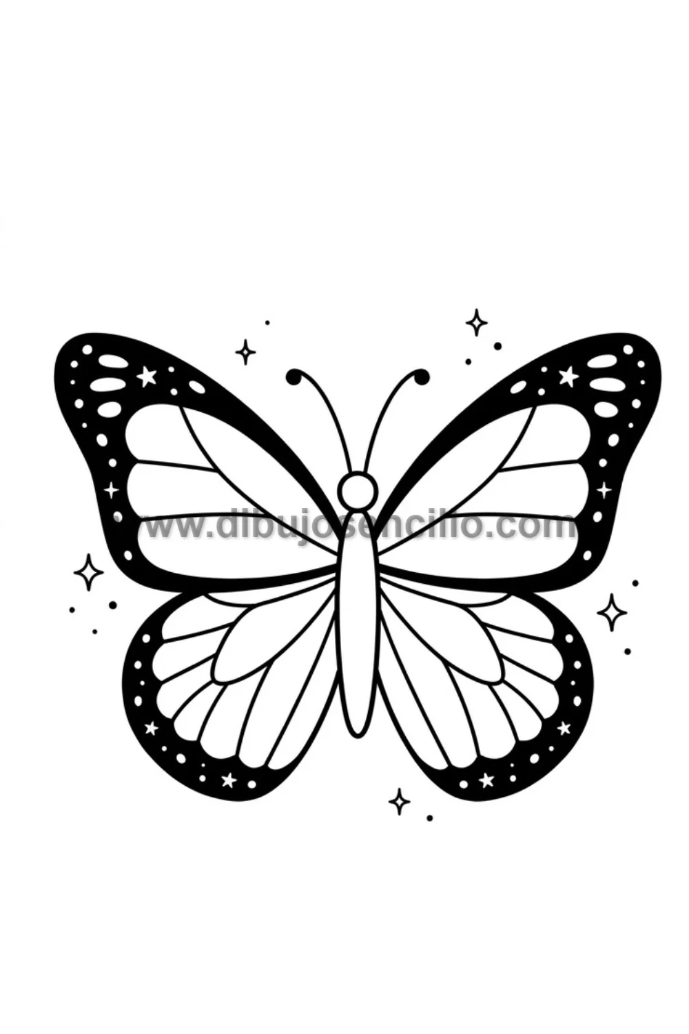 La mariposa monarca con sus nervios característicos que dividen las alas en secciones y sus puntos blancos en el borde exterior, la especie más reconocida y admirable del mundo de las mariposas que realiza migraciones épicas de miles de kilómetros. Su patrón de nervios simples la hace muy interesante y educativa de dibujar.