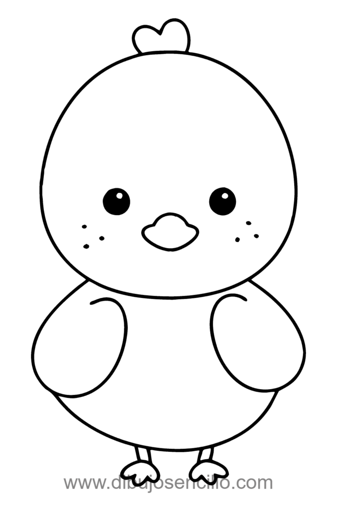 Un patito bebé esponjoso y rechoncho con mejillas sonrosadas y un piquito plano adorable. Su cuerpecito completamente redondo y sus alitas diminutas lo hacen irresistiblemente tierno con muy pocos trazos.