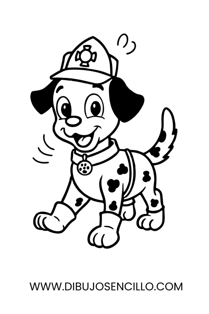 Un Dálmata con manchas negras distintivas sobre pelaje blanco, constitución atlética y expresión alerta característica. El hidrante y casco de bombero referencian la asociación histórica con estaciones de bomberos icónica. El juego de contar manchas y pose corriendo celebran su naturaleza energética y patrón único memorable.