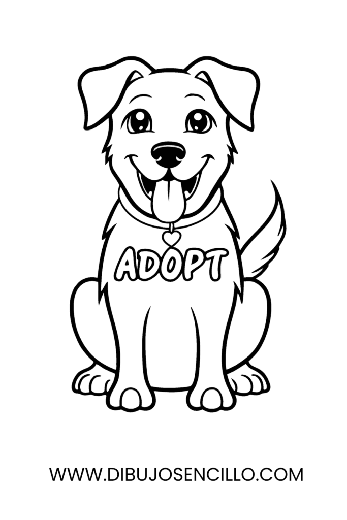 Un perro mestizo con combinación única de características, sonrisa grande, cola moviéndose y apariencia adorable. El corazón de adopción y mensaje «adopta no compres» promueven rescate de perros sin hogar. La celebración de singularidad enfatiza que cada perro mestizo es especial único e igualmente digno de amor incondicional.