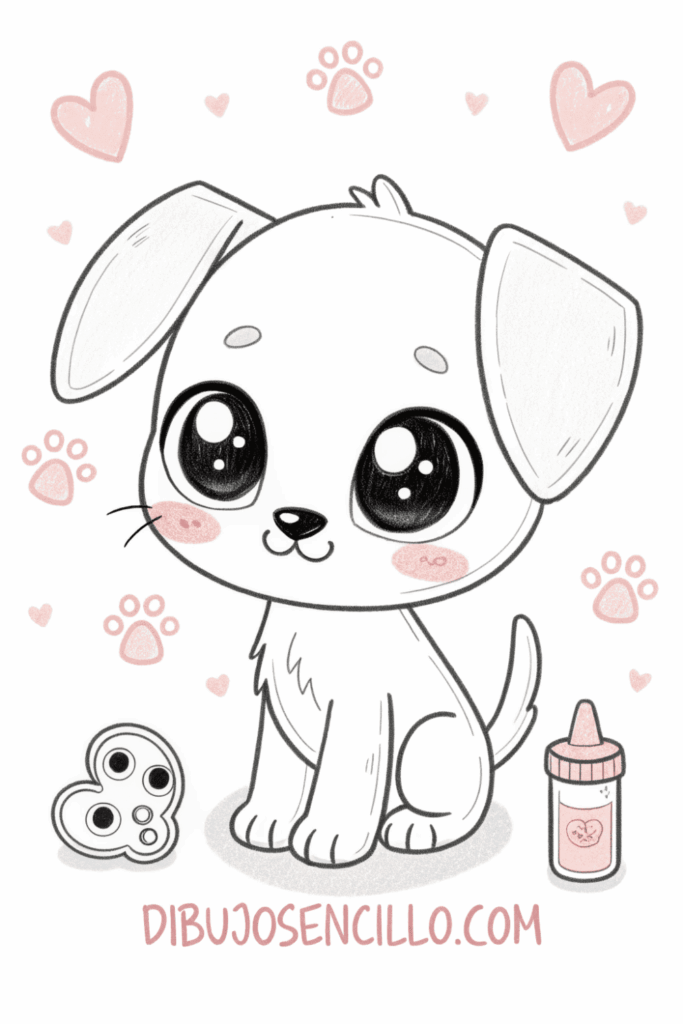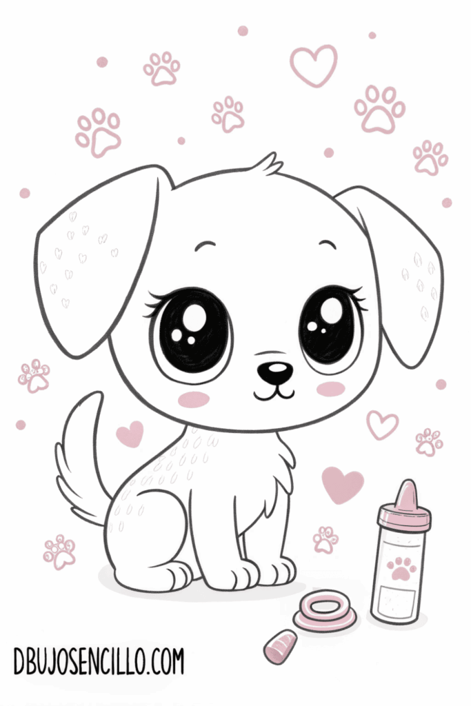 Un cachorro pequeño con ojos enormes y brillantes desproporcionados, cuerpo diminuto y orejas caídas mostrando inocencia total. Las huellas de pata y juguetes de cachorro crean ambiente de hogar nuevo para mascota. El biberón de leche y corazones flotantes enfatizan la ternura irresistible y vulnerabilidad de la etapa temprana.