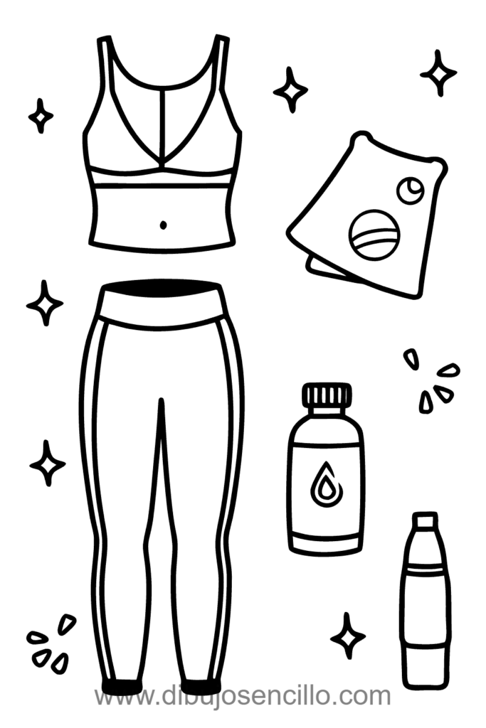 Un conjunto deportivo a juego de leggings y top corto o sostén deportivo mostrando ropa atlética cómoda funcional. Los tenis deportivos y botella de agua sitúan el outfit en contexto de gimnasio o yoga activo. El tapete de yoga y símbolos de fitness celebran la tendencia de moda deportiva que combina función con estilo.